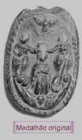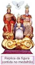![]() | ![]() | A representação artística das três pessoas divinas, Pai, Filho e Espírito Santo se caracterizam pela imagem do Pai, mais velho, do Filho, mais jovem, insinuando Sua presença no tempo e do Espírito Santo, em forma de pomba como narra o Evangelho por ocasião do Batismo de Jesus. É a síntese da Onipotência de Deus nas três pessoas da Santíssima Trindade coroando Sua Mãe, intercede e advoga por todos nós, pobres pecadores. |
